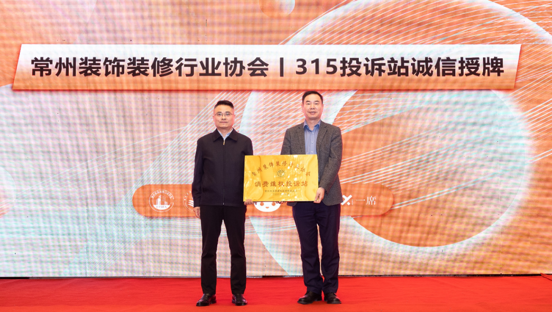董梁副局长首先为常州装饰装修行业协会“315消费维权投诉站”授牌,会长钱志祥代表协会接牌。